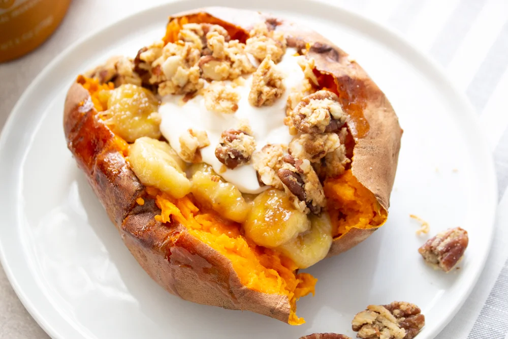 Cut open the sweet potato and slightly mash the inside using a fork. To the sweet potato add yogurt, bananas and top with Maple Pecan granola.